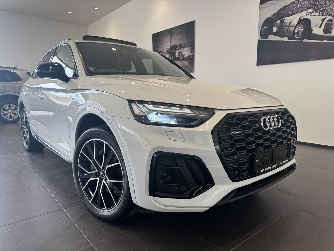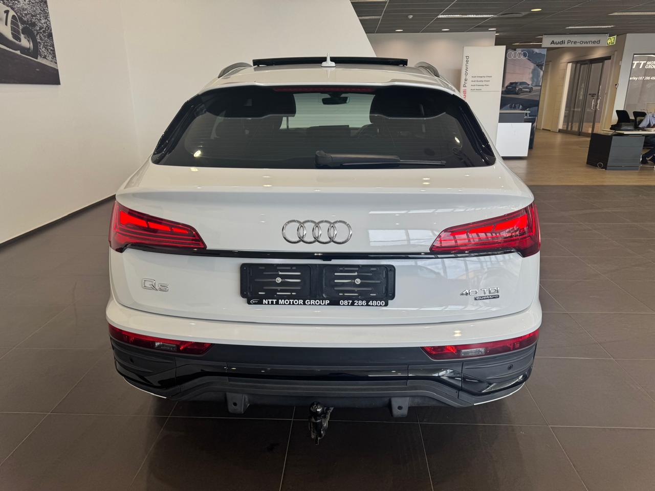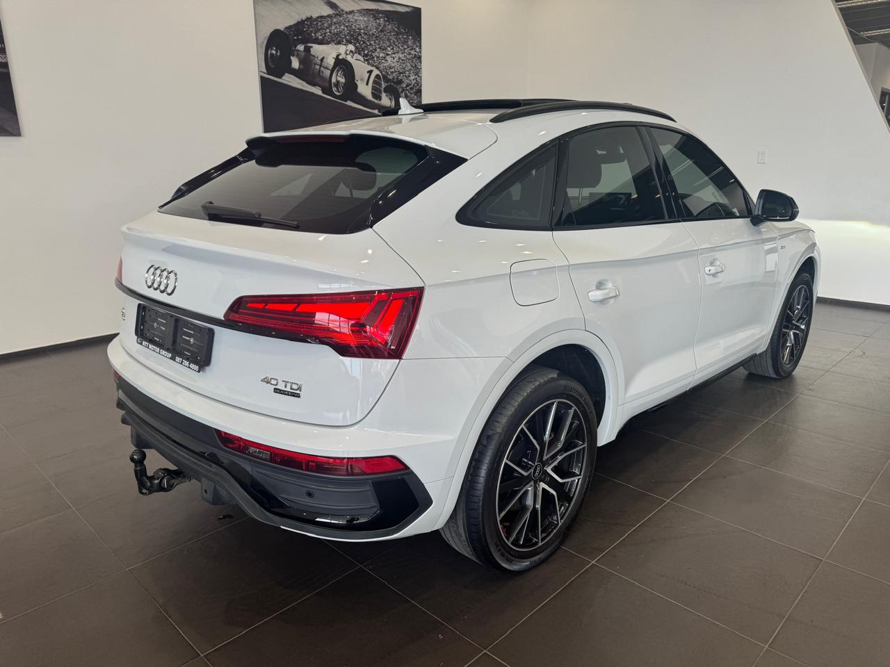 Air Conditioner, Alarm Immobiliser, Alloy Wheels, Auto lights, Bluetooth, Carpet Set, Cartrack, Central Locking, Electric Windows, Metallic Paint, Power Steering, Remainder of Service Plan, Remainder of Warranty, Reverse camera, Service History, Smart key, Sunroof, Tow Bar, Window tint. The Audi Q5 Sportback 40 TDI 140kW quattro S line S tronic is powered by a 140kW turbo-diesel engine paired with S tronic transmission and quattro all-wheel drive, and features a panoramic sunroof, dual-zone climate control, Apple CarPlay and Android Auto, cruise control, Audi Drive Select, power front seats, heated front seats, Dinamica leather combination upholstery, S line interior package, black styling package, black roof rails, black exterior mirror housings, Audi Sport alloy wheels in 5-V-spoke star design, trailer hitch, Convenience Key with sensor-controlled electric tailgate, Matrix LED headlights with LED rear lights, Bang Olufsen 3D Premium sound system, Audi Phone Box with wireless charging and mobile signal amplifier, rear USB charging interfaces, Assist Package City, Comfort Package, and an Audi Maintenance Plan covering 5 years or 100,000 km.